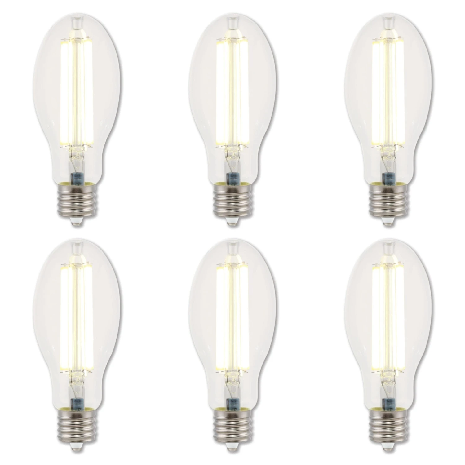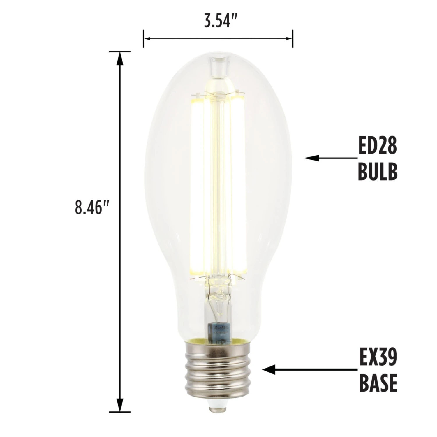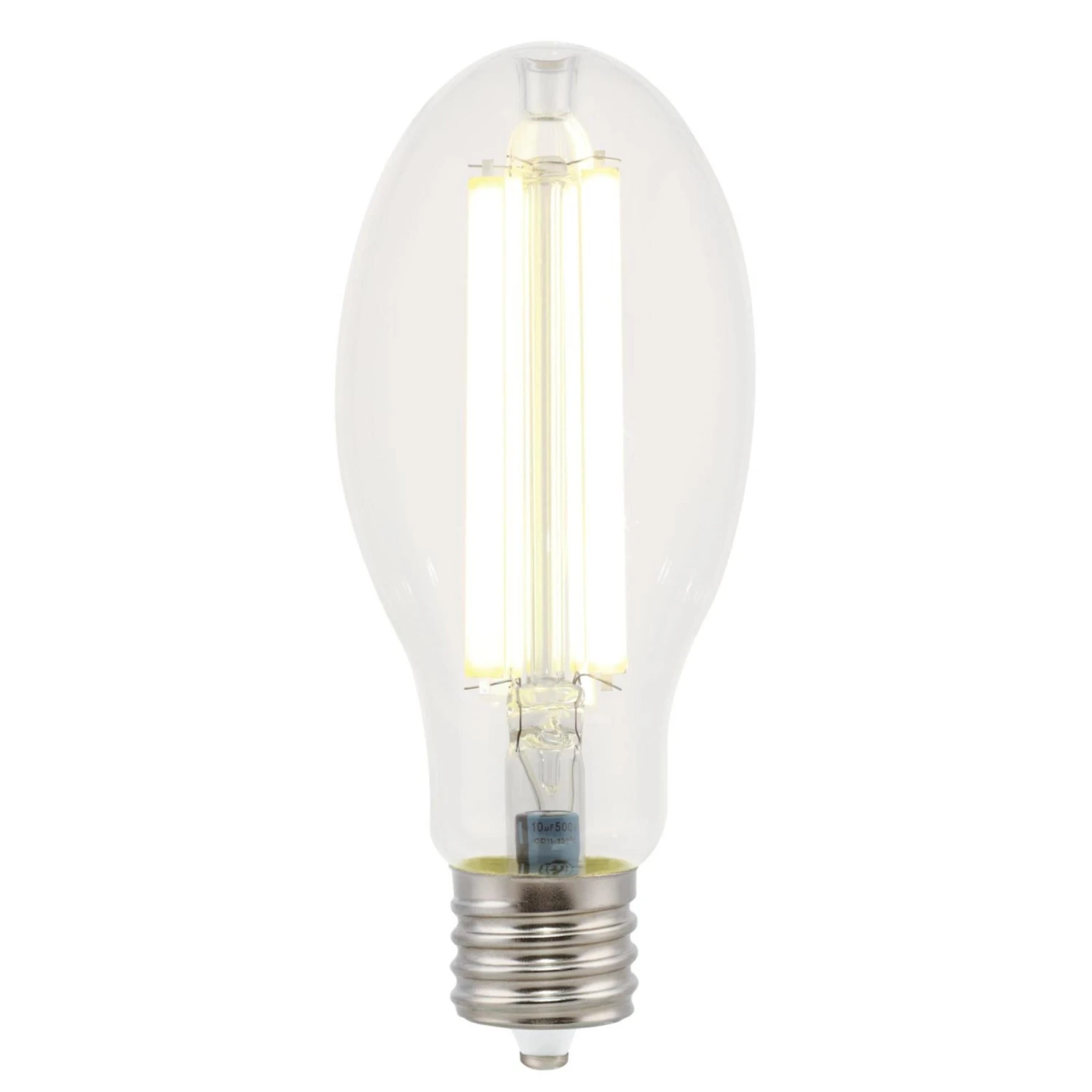 Westinghouse 6 Pack of (5000K) Filament ED28 LED Light Bulbs is ideal for bright light source applications. Ballast bypass energy-efficient replacement for 175-watt HIDs, features universal mounting positions, a voltage range of 120 – 277 volts, and built-in surge protection. In addition, a smaller diameter and lighter weight make them a great alternative to corn cob LEDs. The high-lumen LED bulbs are perfect for outdoor post-top and wall pack lighting with E39 or EX39 sockets. Suitable for use in damp locations and enclosed fixtures. The bright LED bulbs are helpful in geographical areas affected by voltage fluctuations and can withstand momentary surges up to 4000 volts in industrial installations. The 5000K Daylight LED light bulbs turn on instantly and maintain higher light output over their lifetime than HID bulbs, with no color shifting. UL/CUL listed. FCC and RoHS compliant. Product reference number 5225120.