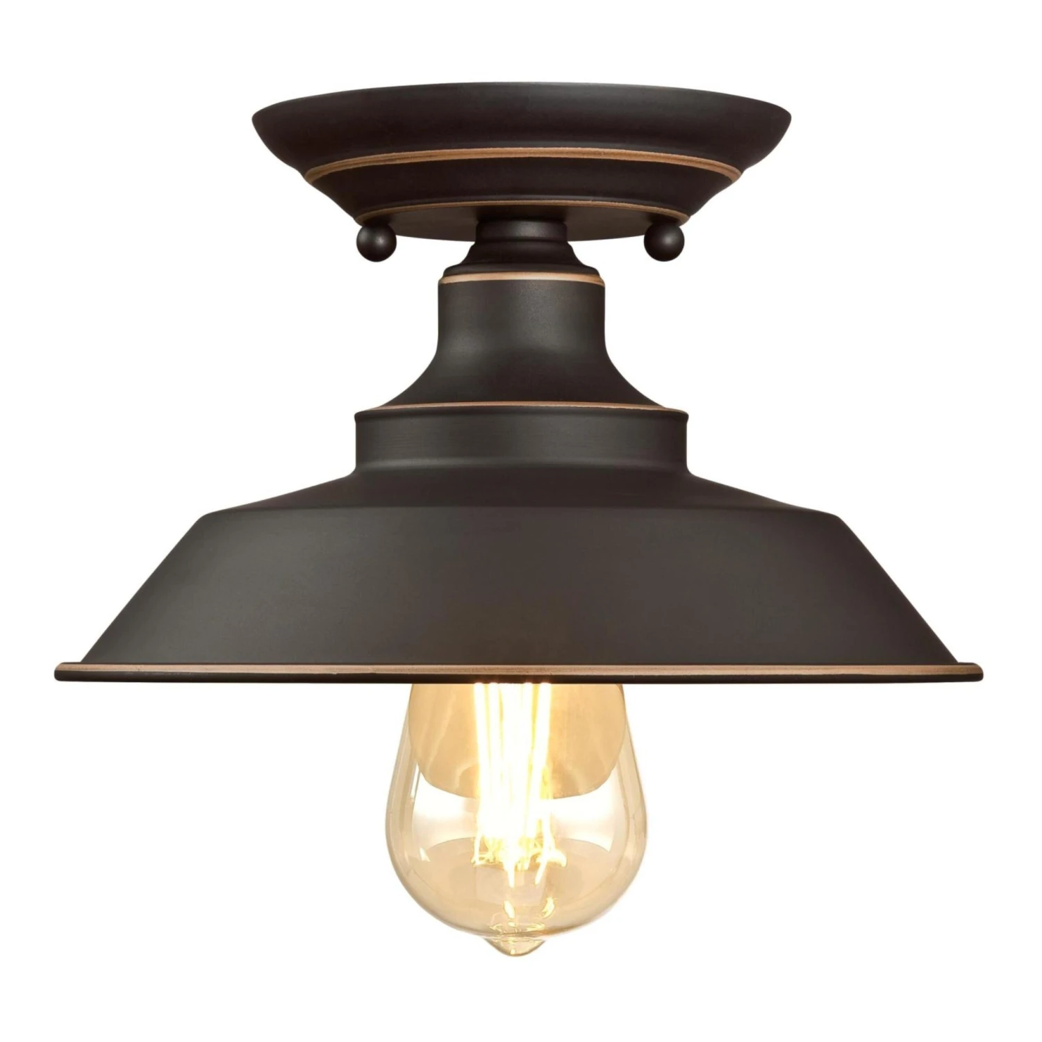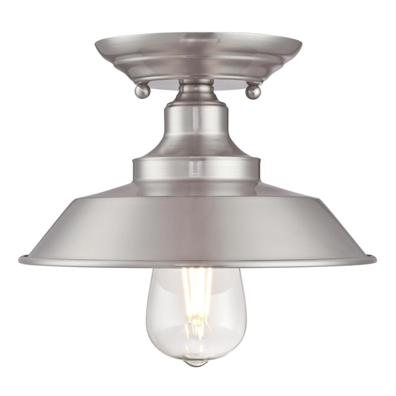 Add vintage charm and classic appeal to any setting with the Westinghouse Iron Hill semi-flush mount ceiling fixture. The wide metal shade comes in a bright brushed nickel finish, adding retro style with modern-day appeal, while the white finish inside the shade creates bright illumination. Perfect for low or high ceilings, bedrooms, hallways, living rooms, and dining areas. Backed by a five-year limited warranty and ETL/CETL listed for safety. Trust in the exceptional quality, reliability, and functionality of a global brand like Westinghouse. Product reference number 63700.
