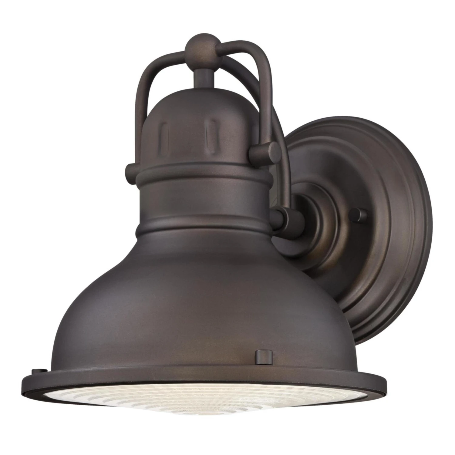 This Westinghouse Orson One-Light Dimmable LED Outdoor Wall Lantern offers an industrial look and saves you money at the same time. This fixture features integrated LED technology with no bulbs to replace. Consumes only 9 watts, 78% less energy than an incandescent fixture, with the brightness equivalent to 1-40W incandescent bulb. Made of steel, this lantern features an oil rubbed bronze finish and prismatic lens. This lantern was designed with industrial details to complement styles from vintage to industrial farmhouse to nautical. This lantern directs light downward which reduces light pollution making it dark sky friendly. It is ideal for entryways, garages, and porches. The lantern is 11-5/8 inches height by 10-5/8 inches wide, it extends 11-5/8 inches from the wall, and it measures 5-1/16 inches height from the center of the outlet box. The back plate measures 6-3/16 inches (D). The fixture includes an integrated 9-watt LED. ETL/CETL listed. Backed by a five-year limited warranty. Westinghouse is a trusted, global brand. Westinghouse knows lighting and offers products with exceptional quality, reliability and functionality. Product reference number 62046.